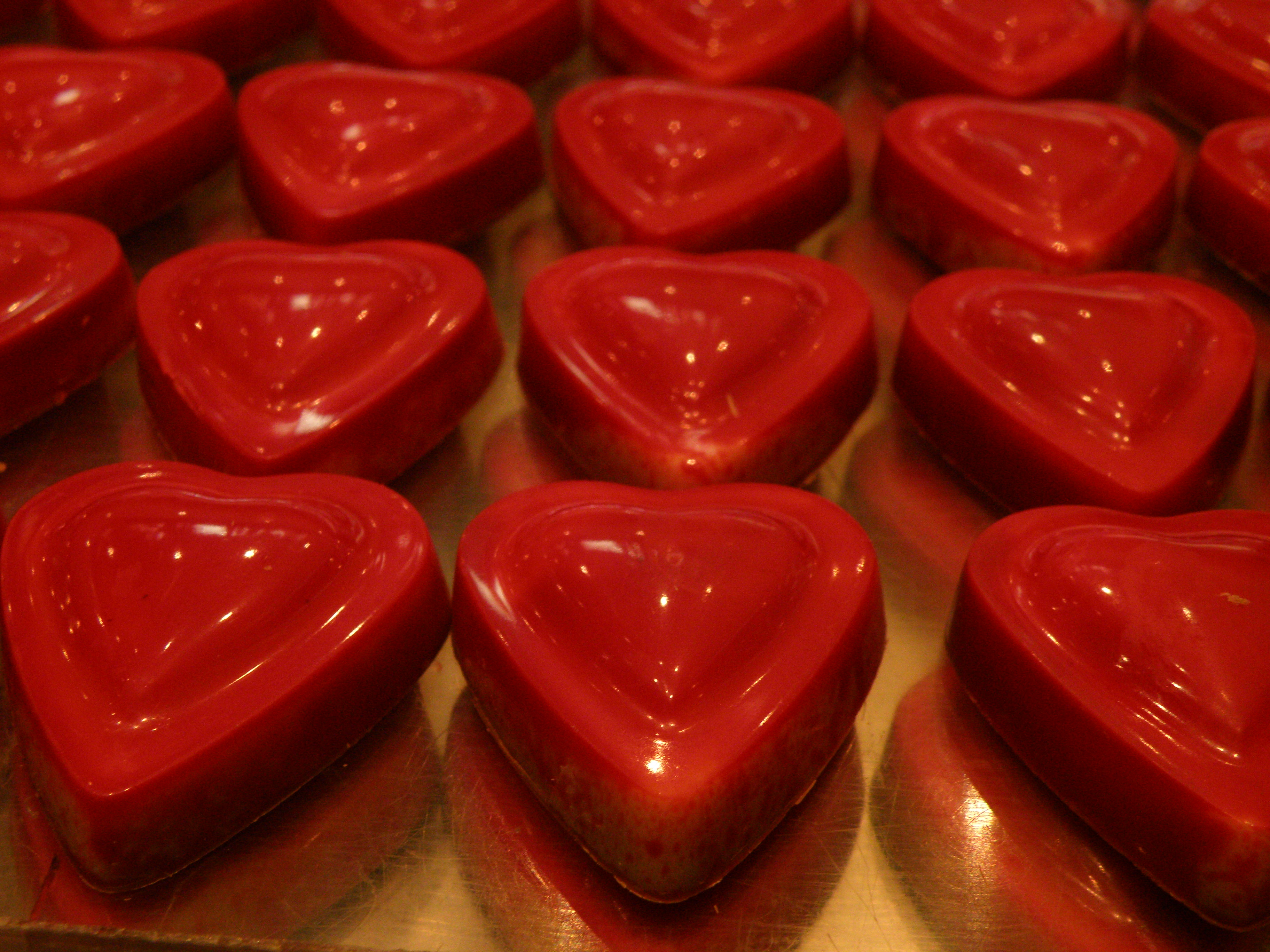 Bombones San ValentÃn, deliciosos bombones realizados con frambuesa natural, caramelo y chocolate blanco. Además de estos podemos encontrar toda la gran variedad de bombones realizados por nosotros con chocolate Valrhona y dentro de esta casa con las coberturas más especiales que tiene, descubriendo nuevos aromas con y sabores